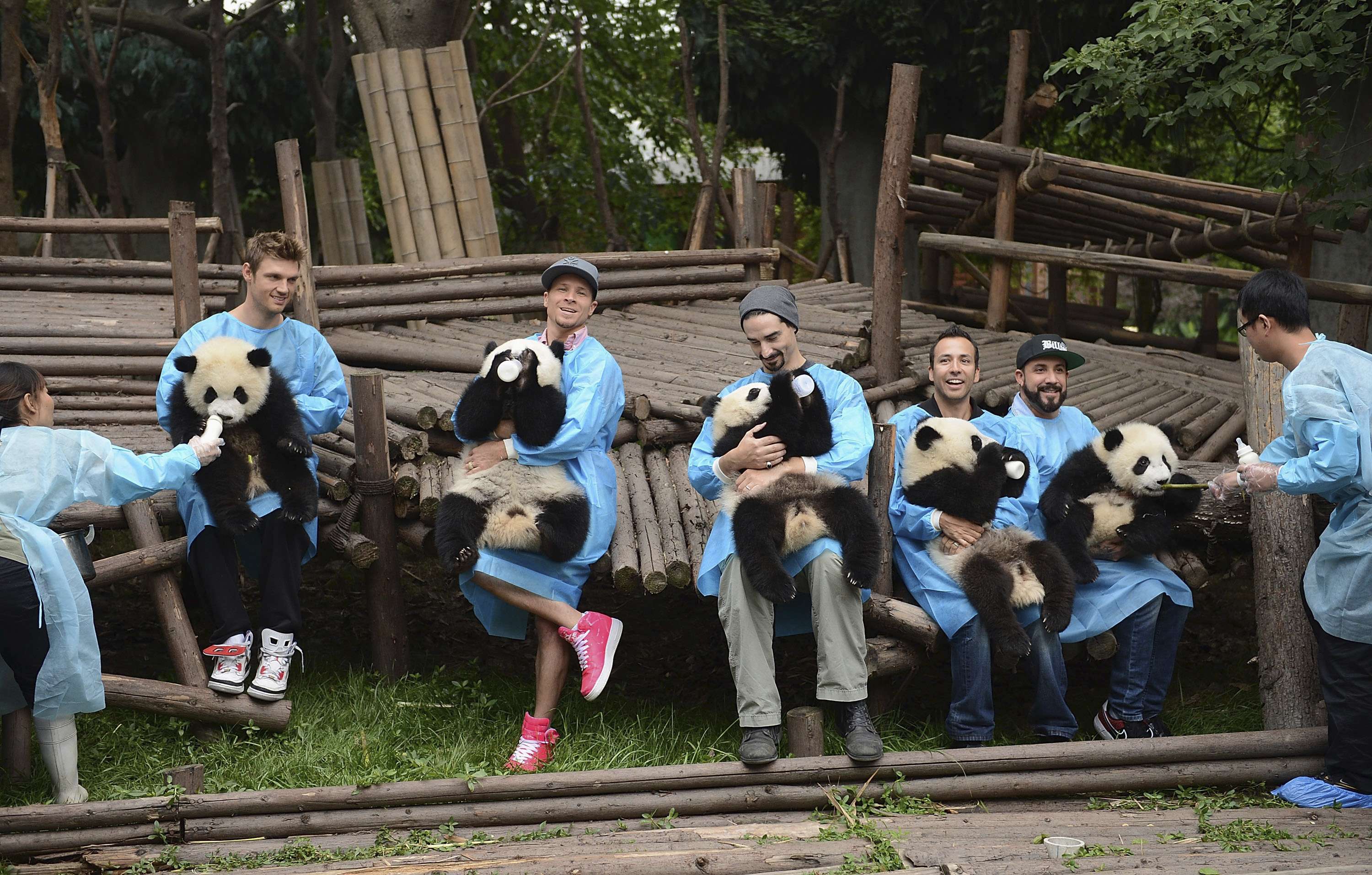 The Backstreet Boys, from 2nd left to second right, Nick Carter, Brian Littrell, Kevin Richardson, Howie Dorough and A.J. McLean hold giant panda cubs at the Chengdu Research Base of Giant Panda Breeding in Chengdu, Sichuan province on May 30.