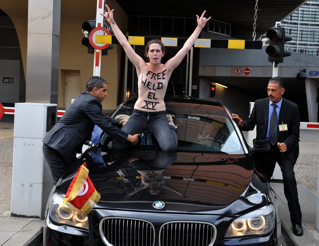 FEMEN Topless Protesters Jump On Tunisian PM Ali Larayedh's Car In Brussels http://www.huffingtonpost.com/2013/06/25/topless-protesters-jump-on-car-femen-tunisian-pm_n_3494790.html#slide=2614263