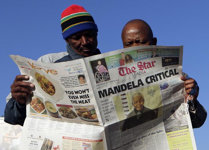 Men read a newspaper next to a stall in Soweto, June 24, 2013. REUTERS/Siphiwe Sibeko