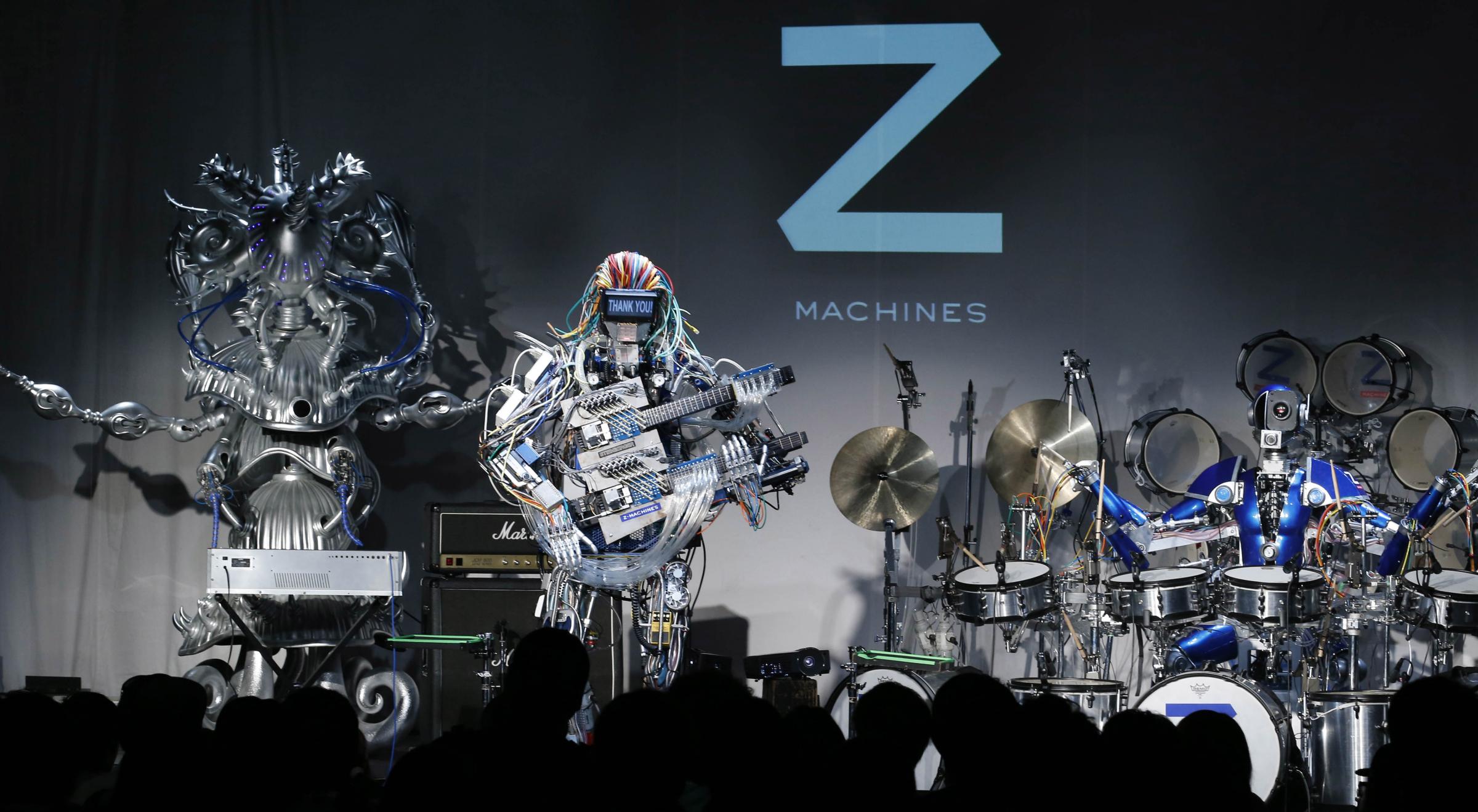 Robot music band Z-Machines members, guitarist robot Mach, center, keyboard player robot Cosmo, left, and drummer robot Ashura, perform during their first live event at Liquid Room in Shibuya in Tokyo on Monday night.