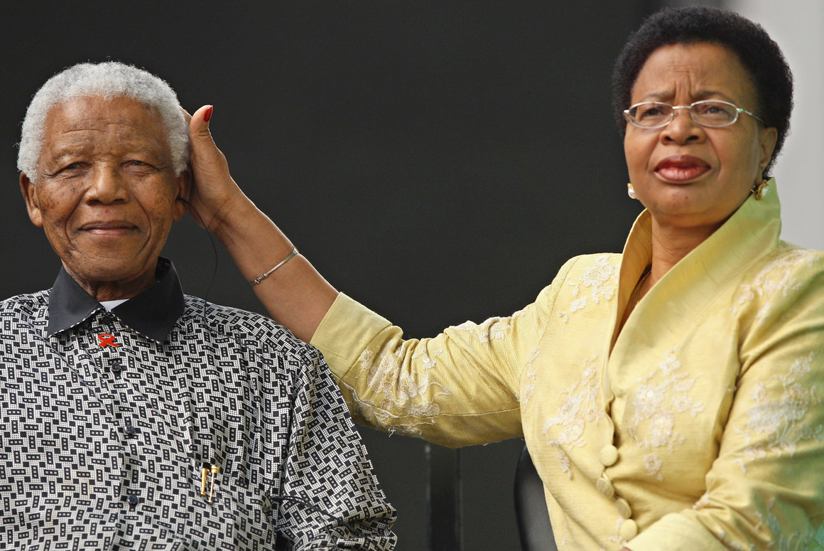 Presidential favourite Jacob Zuma (L) helps former South African president Nelson Mandela at the end of an African National Congress (ANC) election rally in Johannesburg on April 19, 2009. In a sea of black and gold, more than 100,000 ANC supporters today feted an anticipated victory in next week's South African elections, electrified by the presence of Nelson Mandela and presidential favourite Jacob Zuma. AFP PHOTO / ALEXANDER JOE (Photo credit should read ALEXANDER JOE/AFP/Getty Images)