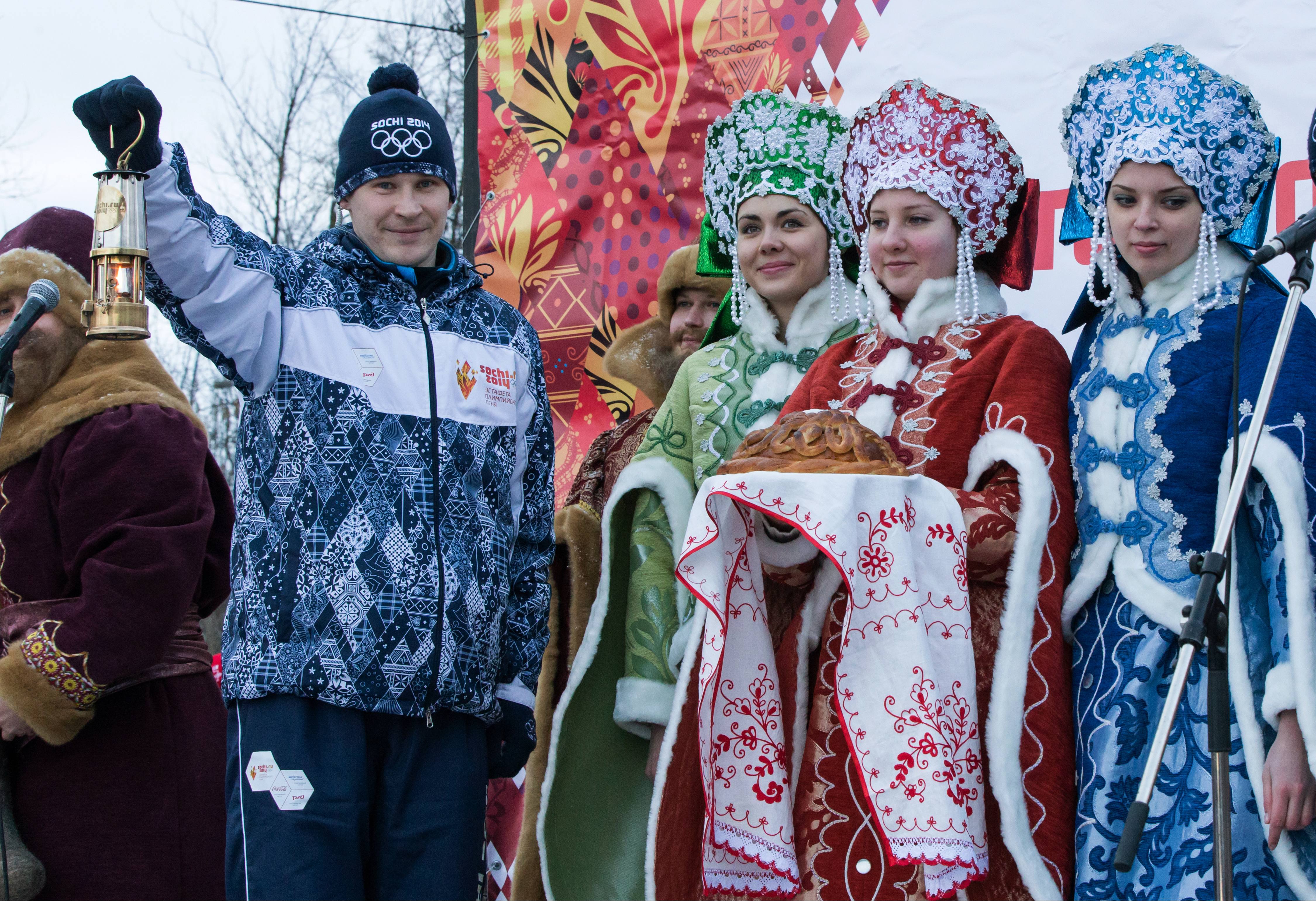 Performers dressed in folk costumes welcome Olympic flame with Russian traditional bread-and-salt during the Olympic torch relay in Yelets, some 237.5 miles south of Moscow, Russia, Tuesday, Jan. 14, 2014. The 40,389 mile Sochi torch relay, which started on Oct. 7, is the longest in Olympic history. The torch has traveled to the North Pole on a Russian nuclear-powered icebreaker and has even been flown into space.