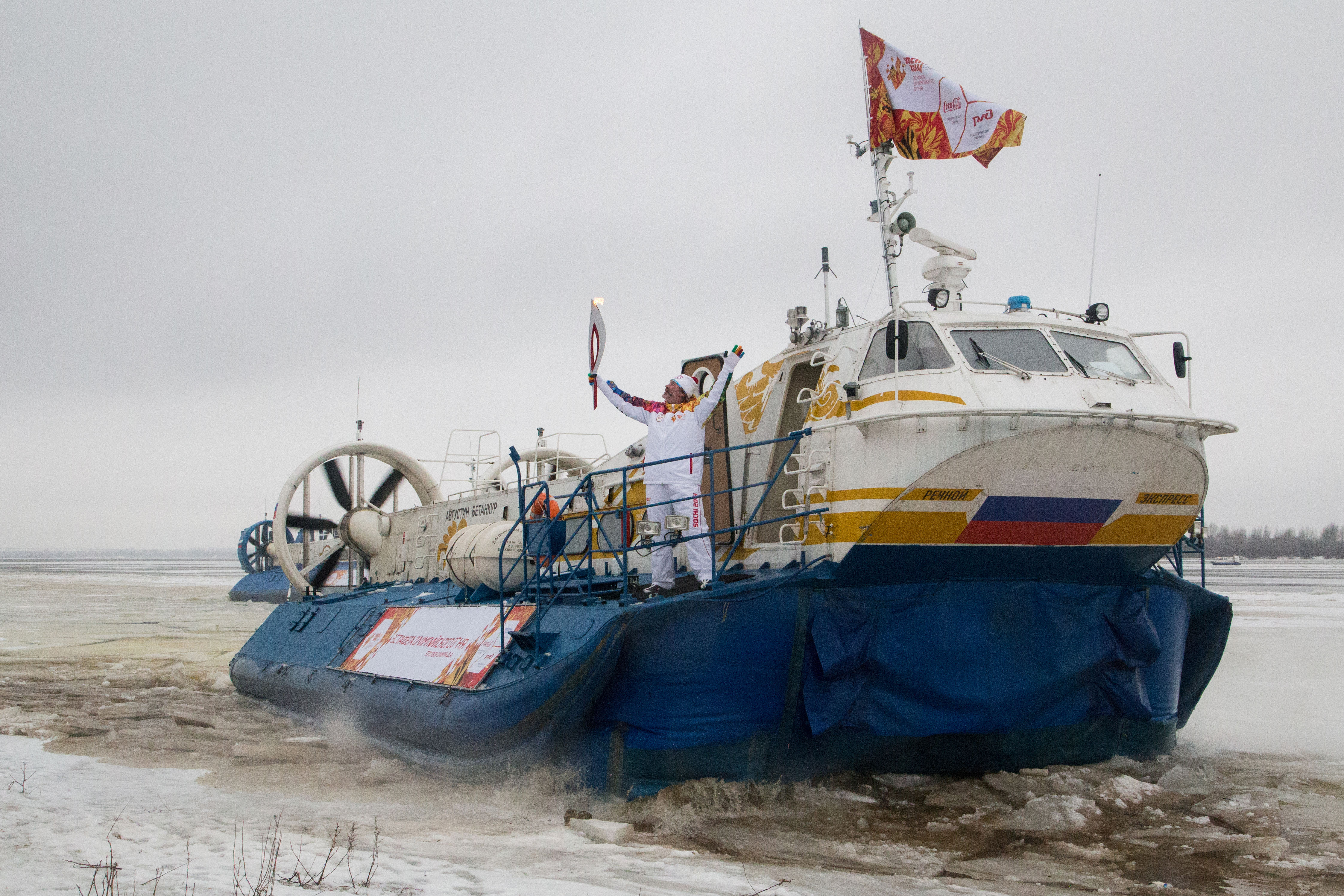 Olympic torch bearer Alexander Tabachnikov carries an Olympic torch on a hovercraft during the torch relay in Nizhniy Novgorod, Russia, Wednesday, Jan. 8, 2014