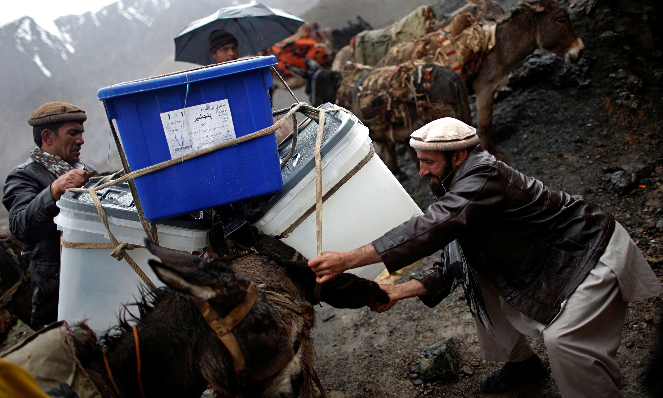 APRIL 3: Donkeys help Afghan election workers transport ballot boxes and election materials to polling stations through Mazar-i-Sharif to Kishindih district in Balkh province, Afghanistan. Elections are Saturday. (Mustafa Najafizada/Assoicated Press)