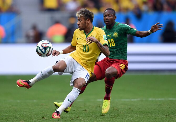 Brazil's Neymar fights for the ball with Cameroon's Allan Nyom during their 2014 World Cup Group A match at the Brasilia national stadium.Reuters