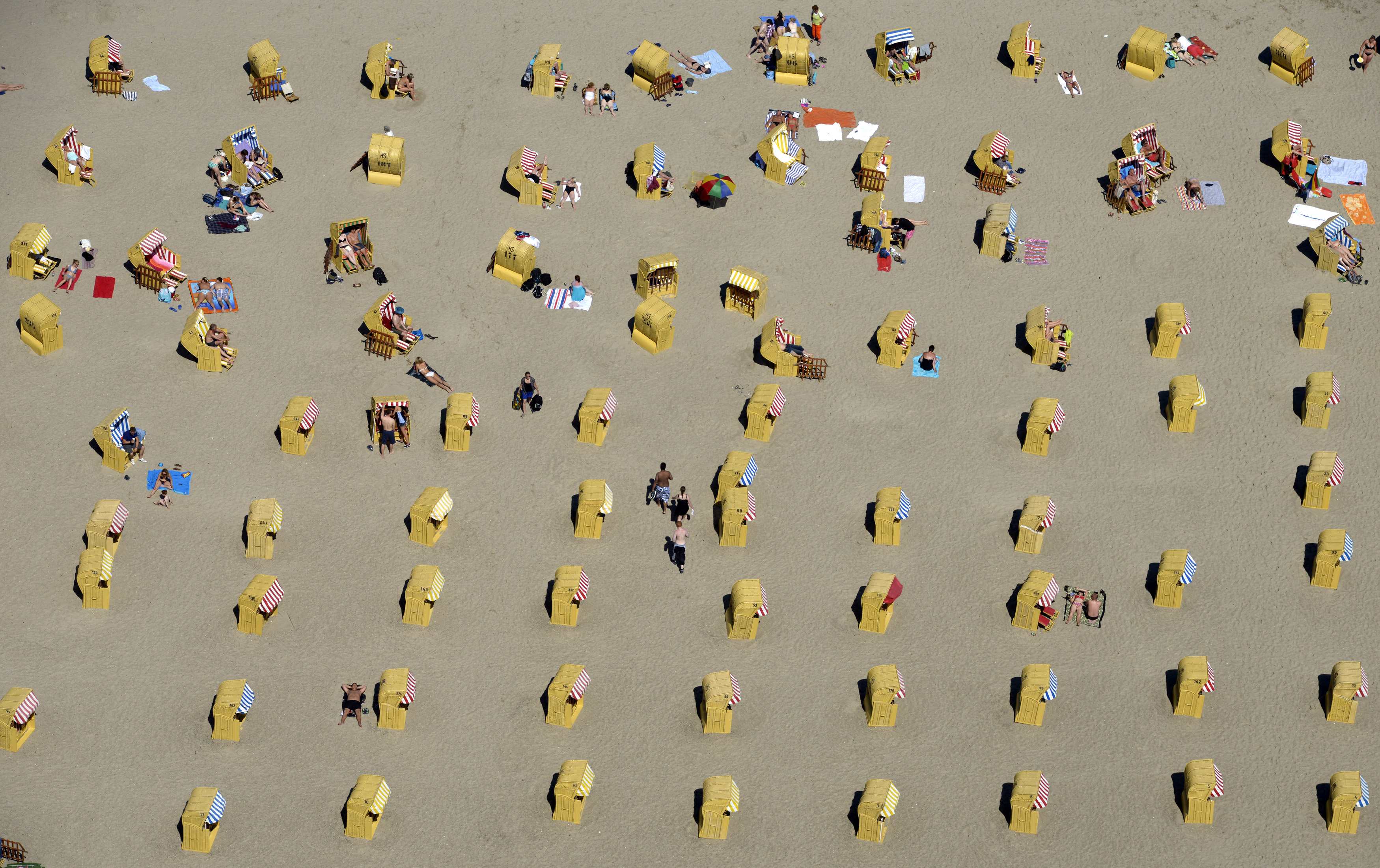 People take a sunbath in beach chairs at a beach in Travemuende by the Baltic Sea, Germany.