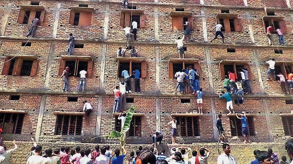 Indians climb the wall of a building to help students appearing in an examination in Hajipur, in the eastern Indian state of Bihar. Even with police presence, parents and relatives are reported to scale building walls in order to pass notes to help students cheat in their exams.