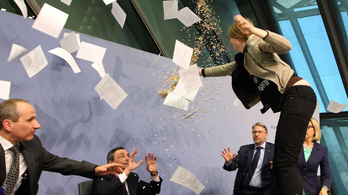 Die Femen-Aktivistin sprang auf Mario Draghis Tisch und bewarf den EZB-Chef mit Konfetti und Papier