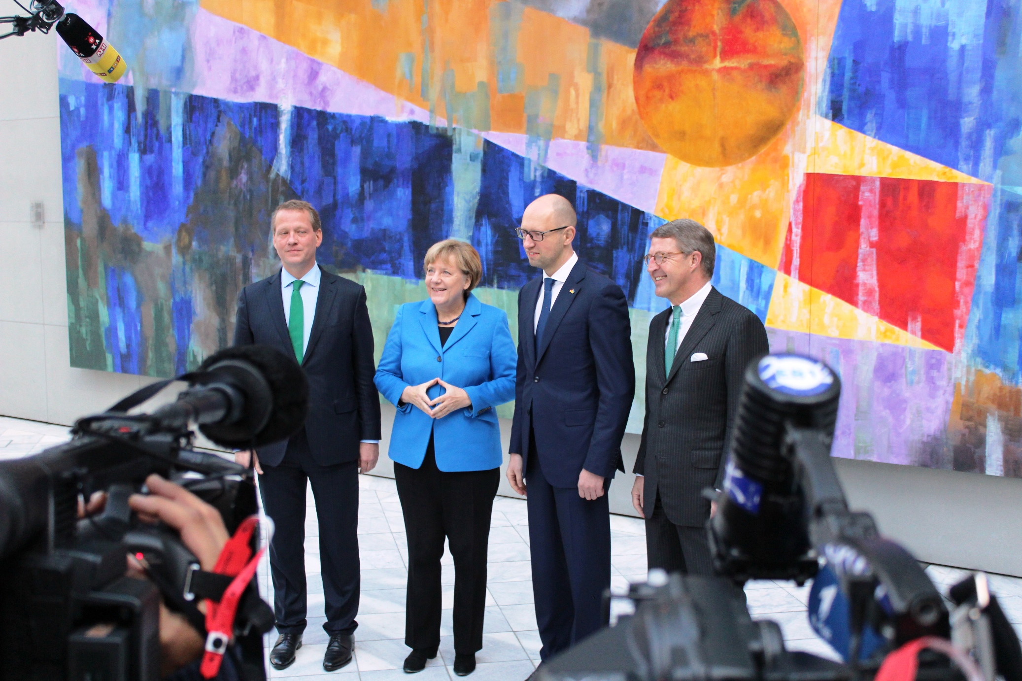 DIHK-Präsident Schweitzer (li.), Bundeskanzlerin Merkel, der ukrainischer Premier Jazenjuk und der Ost-Ausschuss-Vorsitzender Cordes (re.) eröffneten die Ukraine-Konferenz. Fotos: A.Metz