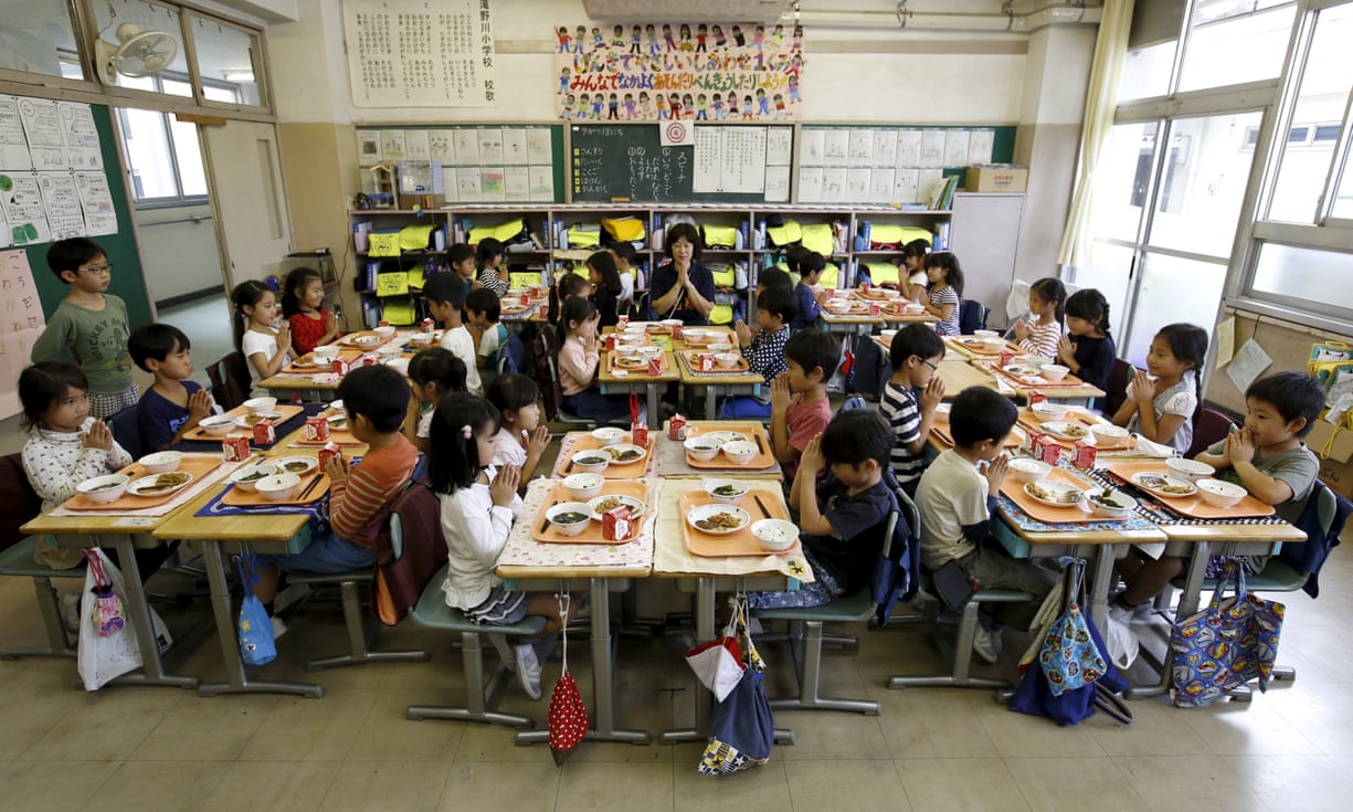 First grade students and teacher Teruko Takakusaki give thanks before lunch at Takinogawa elementary school