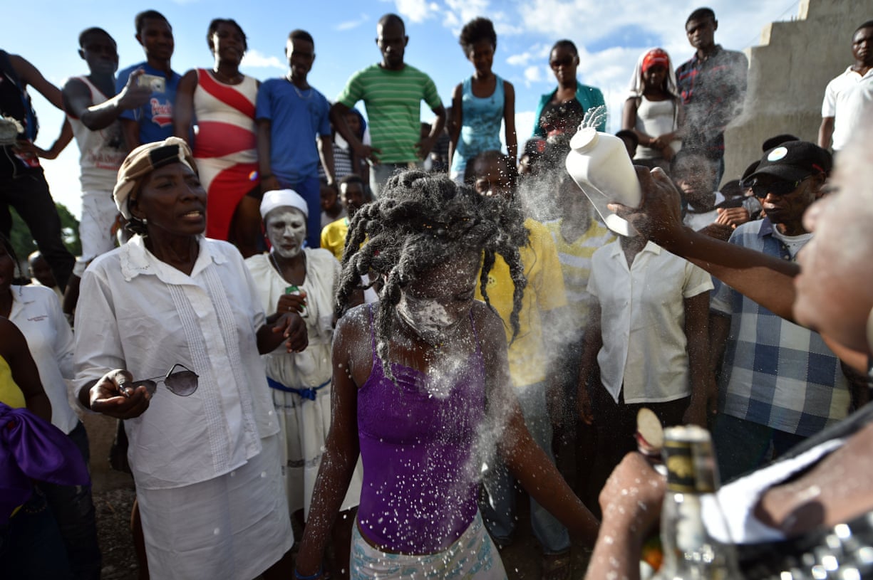 A woman playing the role of a spirit known as a Guédé dances during a Vodou ritual in tribute to spirits of the dead, Baron Samedi and the Guédé family at the national cemetery in Port-au-Prince