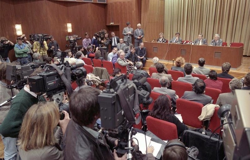 Günter Schabowski (2. von rechts am Pult) auf der Pressekonferenz am 9. November 1989 Bundesarchiv