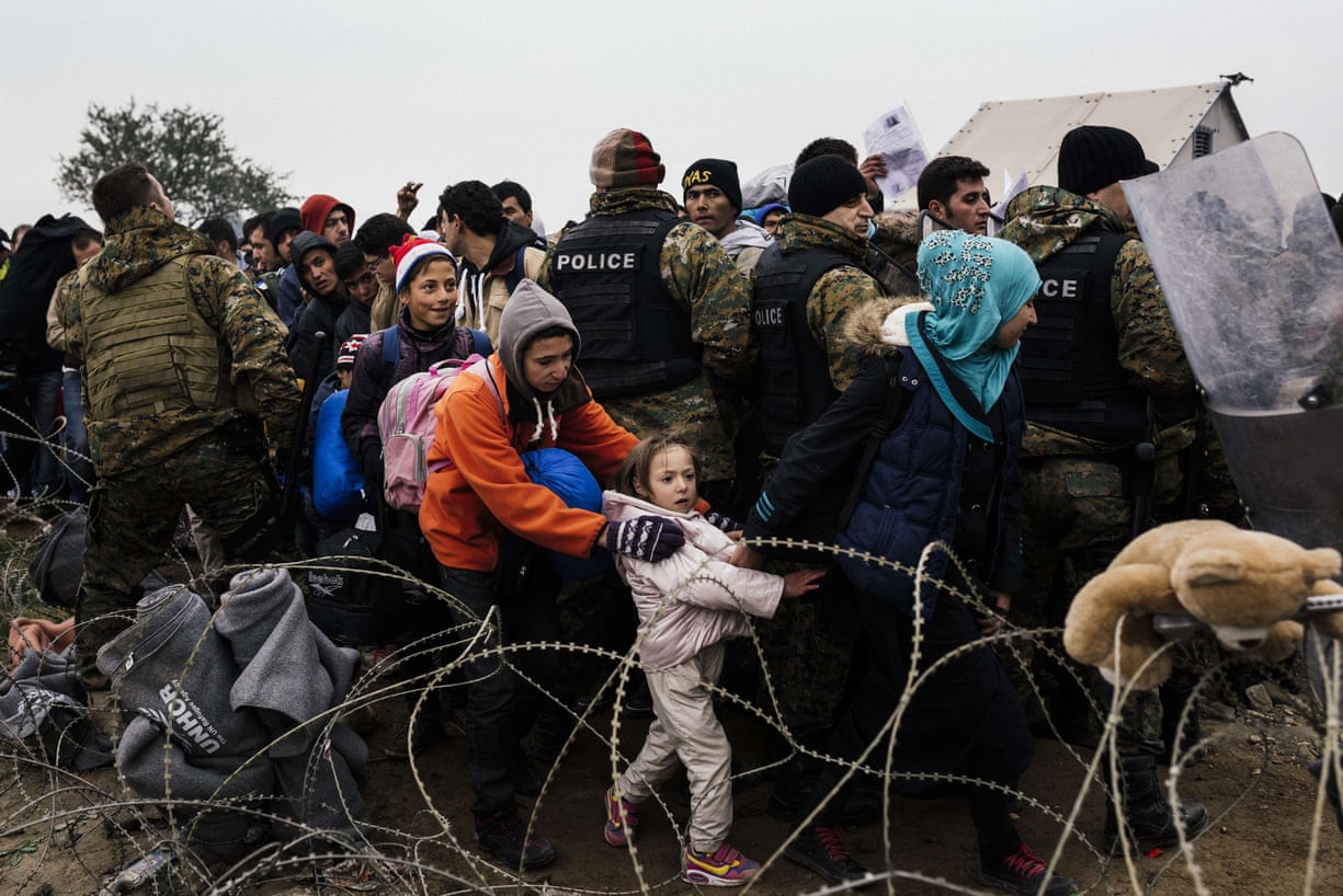 Migrants pass behind a police cordon to try to cross the Macedonian-Greek border
