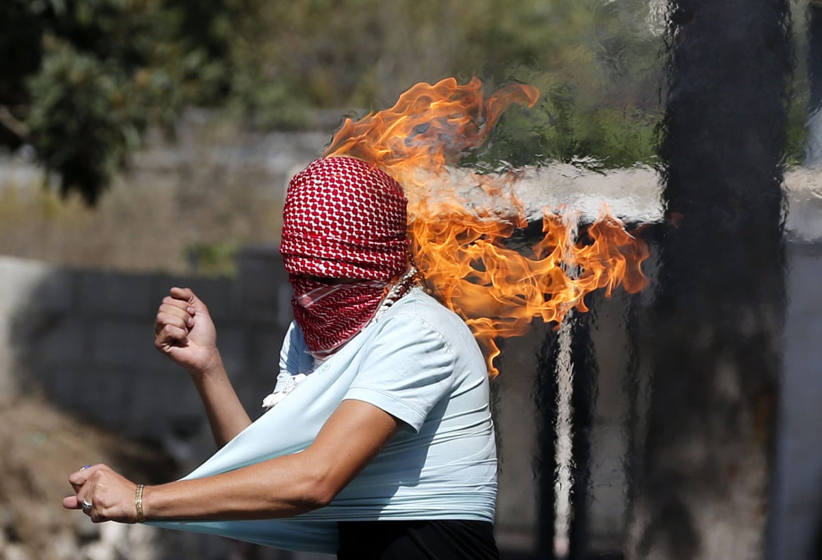 A Palestinian protester sets fire to himself after throwing a molotov cocktail during clashes with the Israeli armed forces in the West Bank city of Hebron