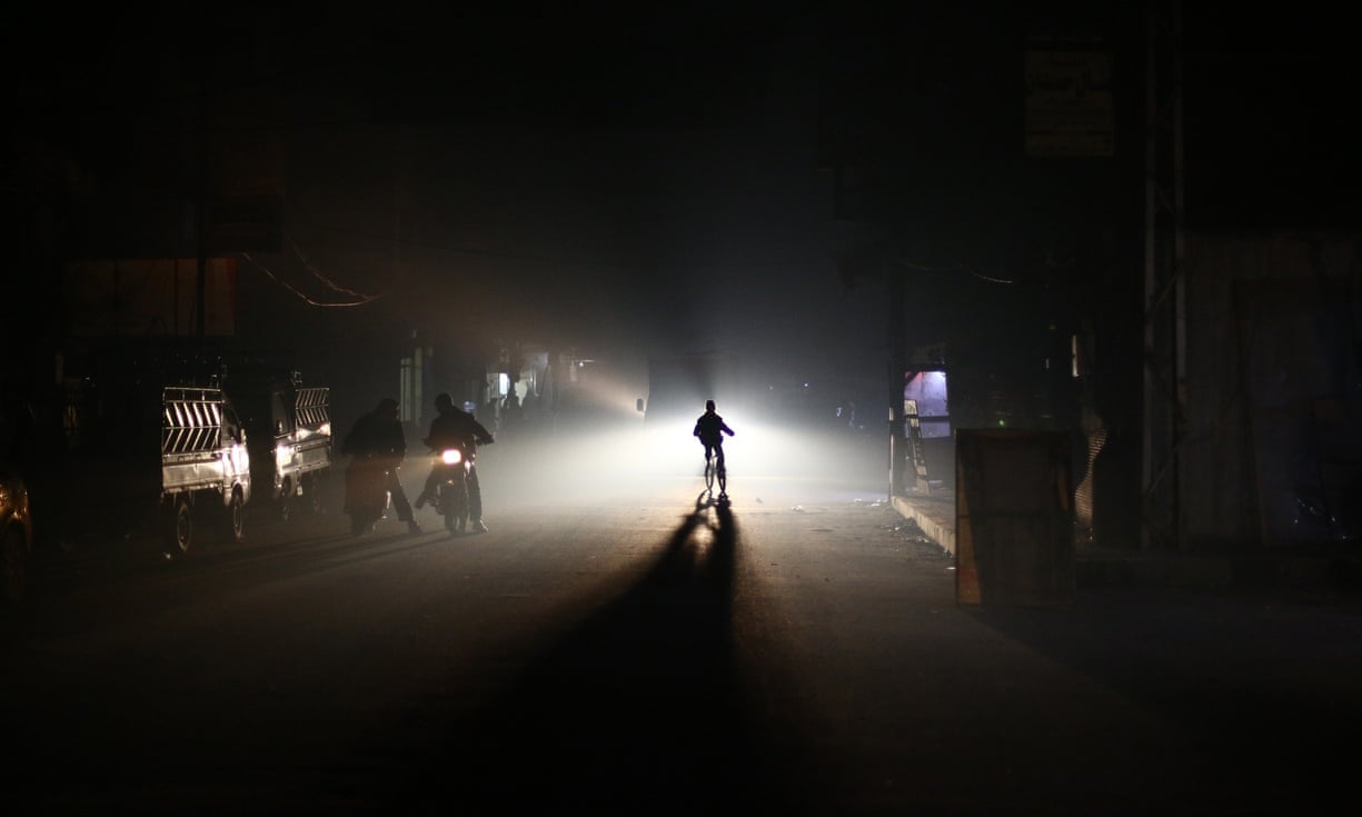 Residents of the besieged rebel town eight miles north-east of Damascus, ride through the street at night during a blackout