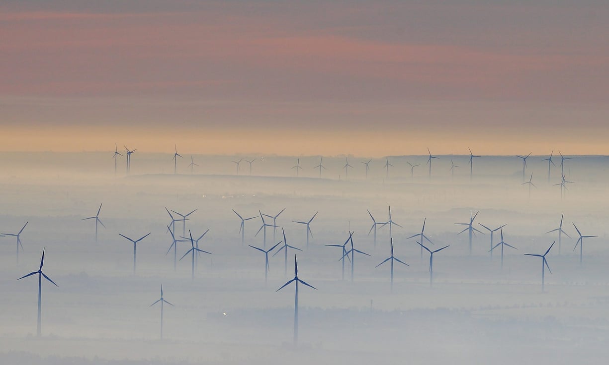 Wind turbines shrouded in fog near Petersberg mountain, Germany. The Petersberg hill, north of Halle/Saale, is the highest point in the Saale region, at 250.4 metres above sea level. Photograph: Jens Wolf/EPA