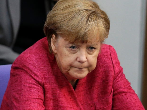 German chancellor Angela Merkel adopts a very serious look as she attends a meeting of the German federal parliament in Berlin. Photograph: Michael Sohn/AP