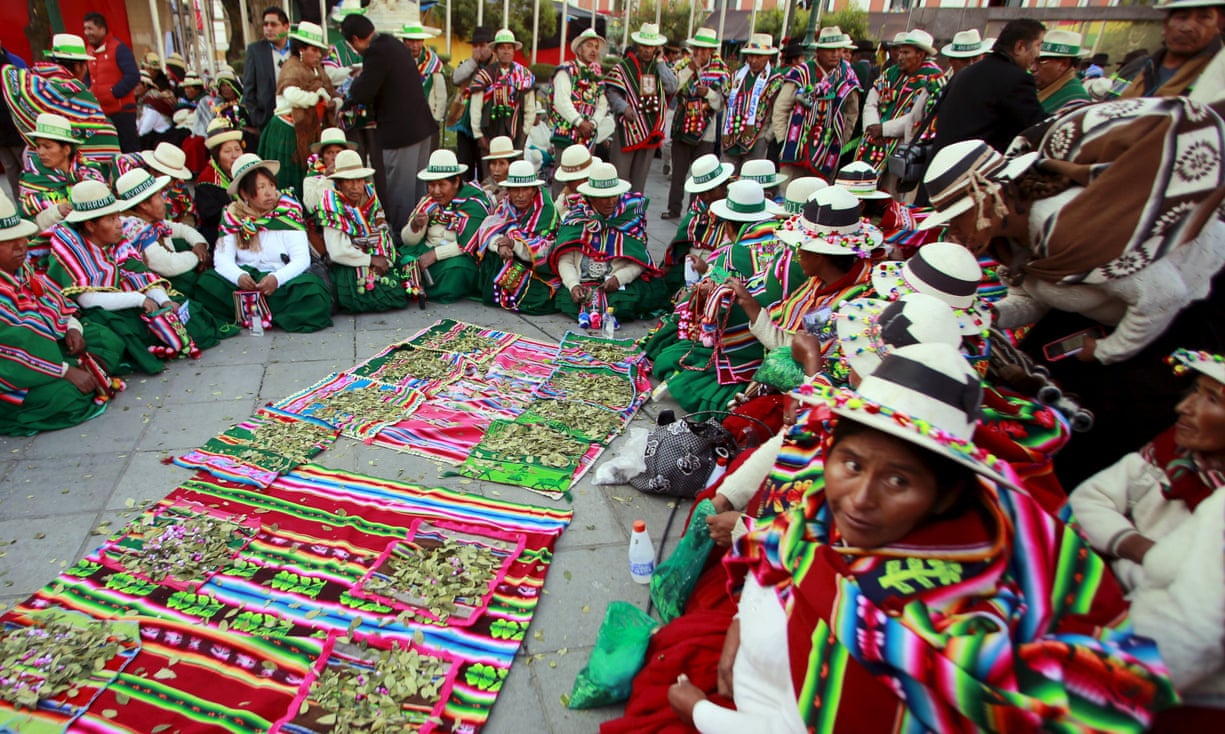 Bolivian indigenous women sit and chew coca leaves at Murillo Square during a ceremony that marks 10 years of President Evo Morales’s administration. Photograph: David Mercado/Reuters