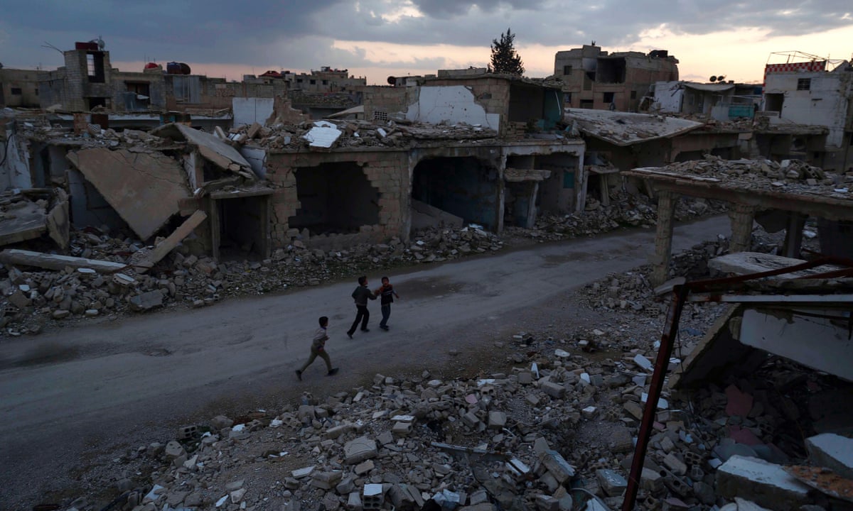 Syrian children walk past heavily damaged buildings in the rebel-held town of Douma, on the eastern edges of the capital Damascus, on the first day of the ceasefire agreement. Photograph: Sameer Al-Doumy/AFP/Getty Images