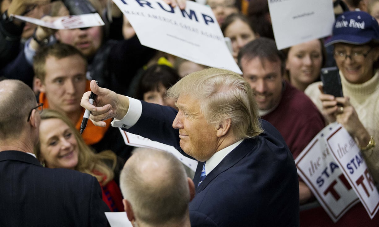Donald Trump gestures to the crowd as he signs autographs at a campaign event at Plymouth State University Sunday. Photograph: David Goldman/AP