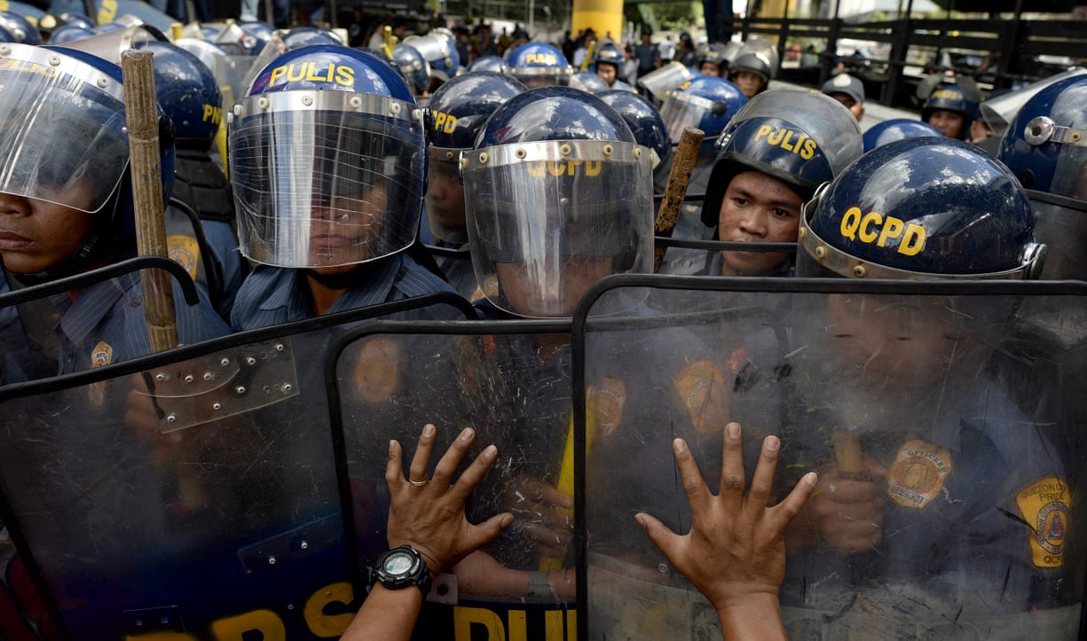 An activist pushes the shields of police officers during a protest near a church in Manila on the 30th anniversary of the fall of President Ferdinand Marcos’ dictatorship