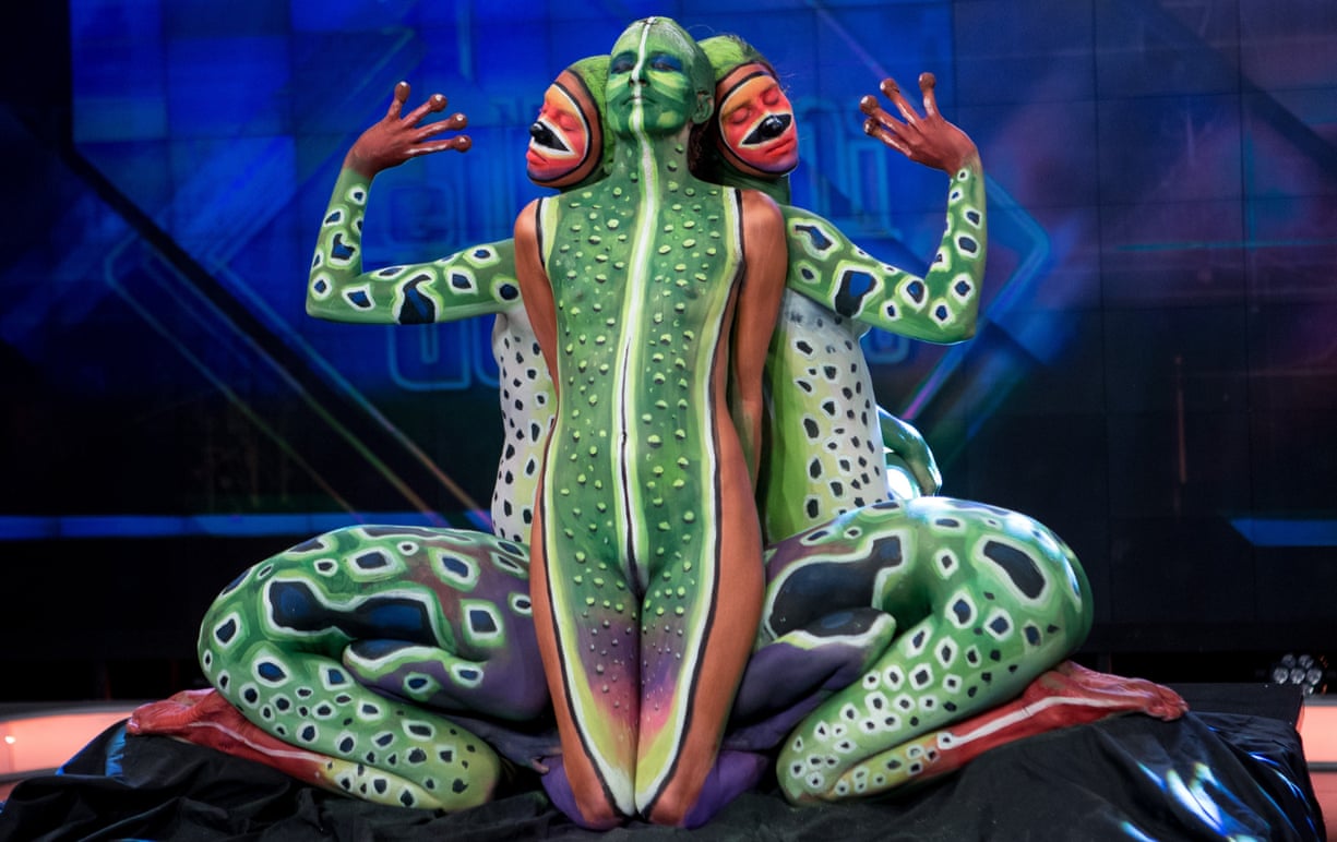 Body painting artists perform a figure in the shape of a frog during the El Hormiguero television programme at the Vertice Studios