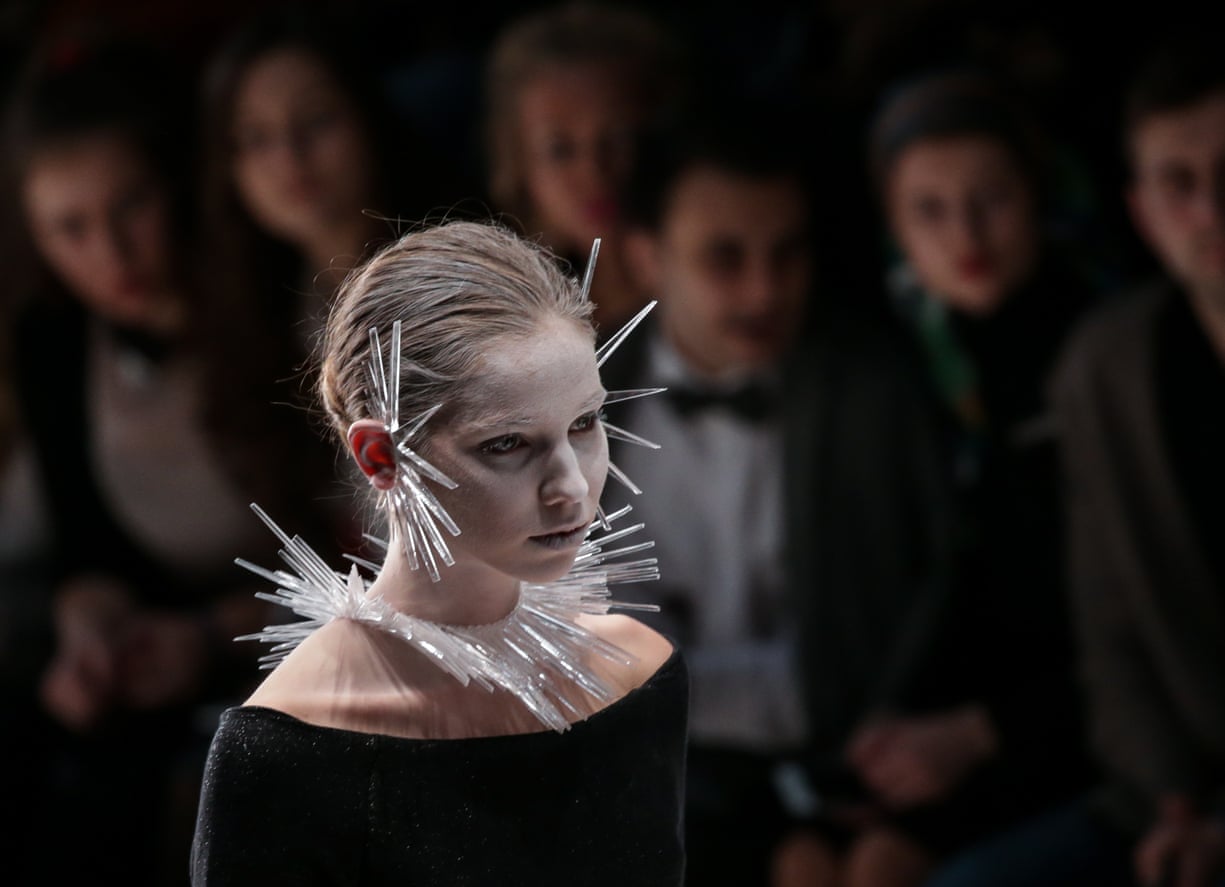 A model shows off creations from the Dimaneu collection at the 2016 Mercedes Benz fashion week