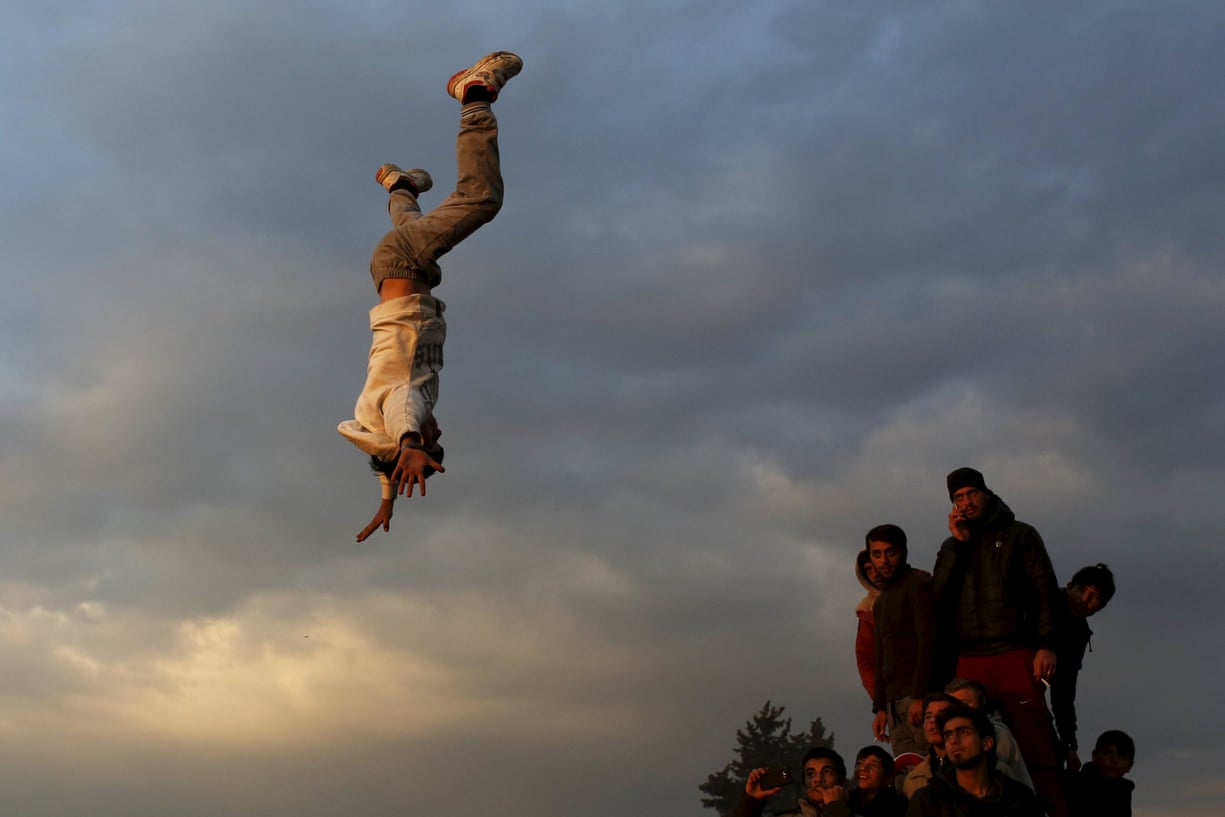 People make a child jump in the aire thanks to a blanket at the makeshift camp of the Greek-Macedonian border, near the Greek village of Idomeni on March 27, 2016, where thousands of refugees and migrants are stranded by the Balkan border blockade. Dozens of hopeful refugees, some carrying babies, rushed to Greece's overwhelmed Idomeni camp on the sealed border with Macedonia on March 27, 2016 following rumours that the frontier would be forced open. (Photo by Sakis Mitrolidis/AFP Photo)