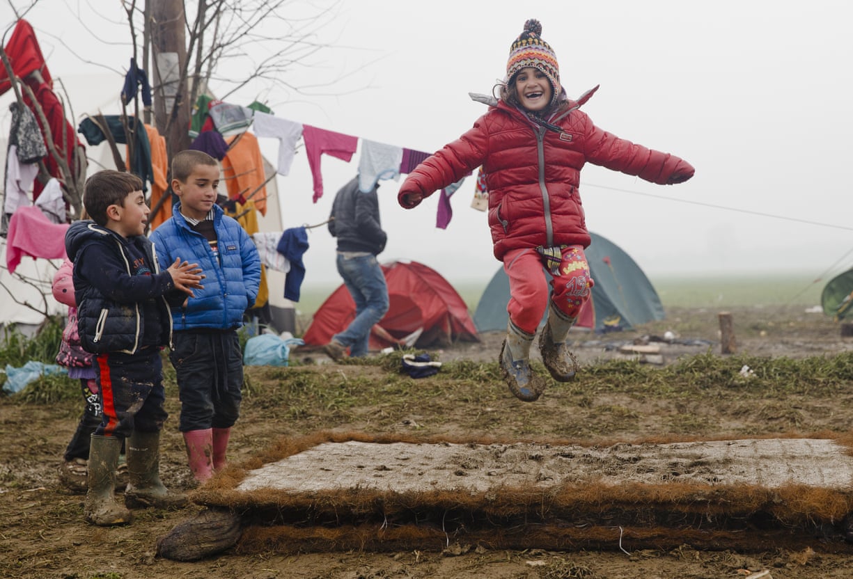 Children have fun bouncing on a discarded muddy mattress at a makeshift camp near the Greek-Macedonian border. The EU has struck a deal to send back refugees