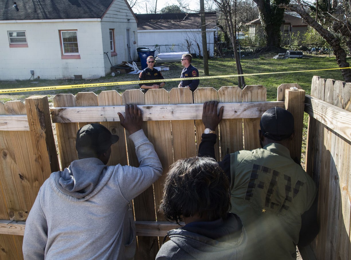 Onlookers peep through a fence as North Carolina police officers work at the scene of a shooting