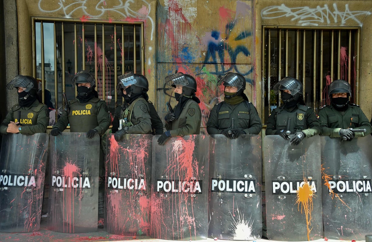 Riot police stand with their paint-splattered shields after a protest against the economic and social policies of President Juan Manuel Santos