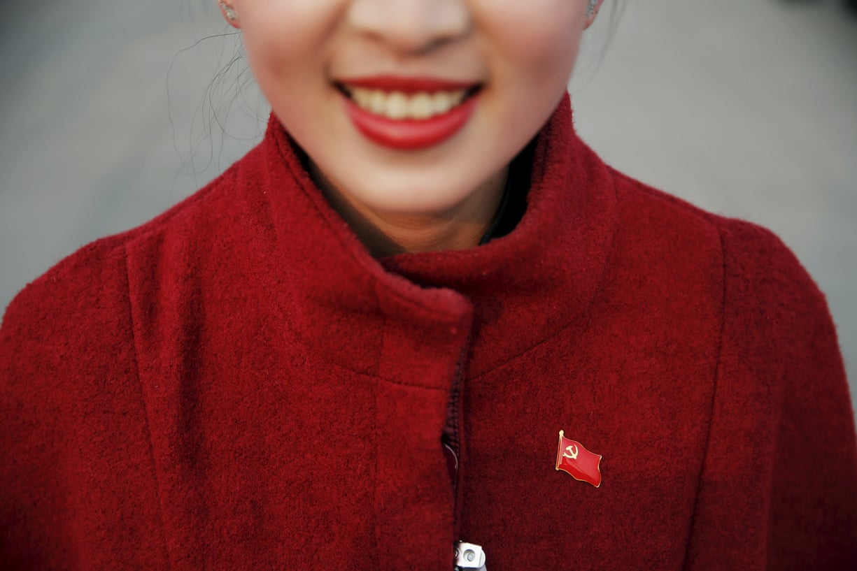 A hostess wears Communist party pin at the National People’s Congress, held in the Great Hall of the People in Beijing