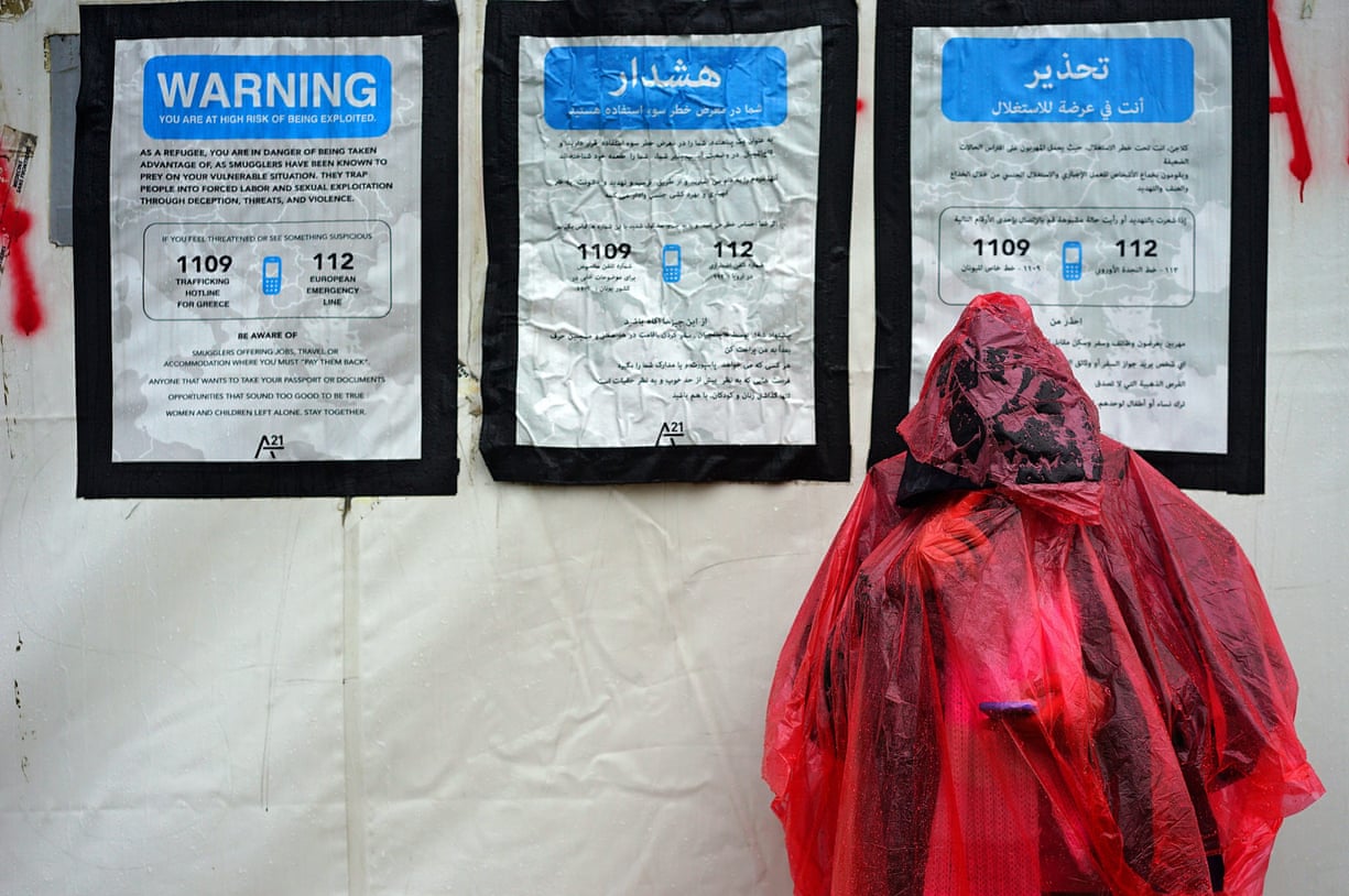 A man reads his mobile phone under plastic covers in a refugee camp on the border between Greece and Macedonia