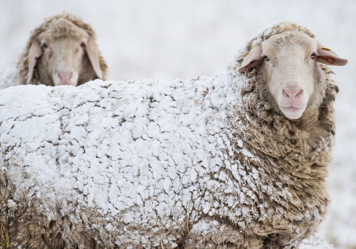 Sheep are covered with snow on a meadow near Sieversdorf, Brandenburg, Germany, 01 March 2016. March 01 marks the beginning of meteorological spring in the northern hemisphere. (Photo by Patrick Pleul/EPA)
