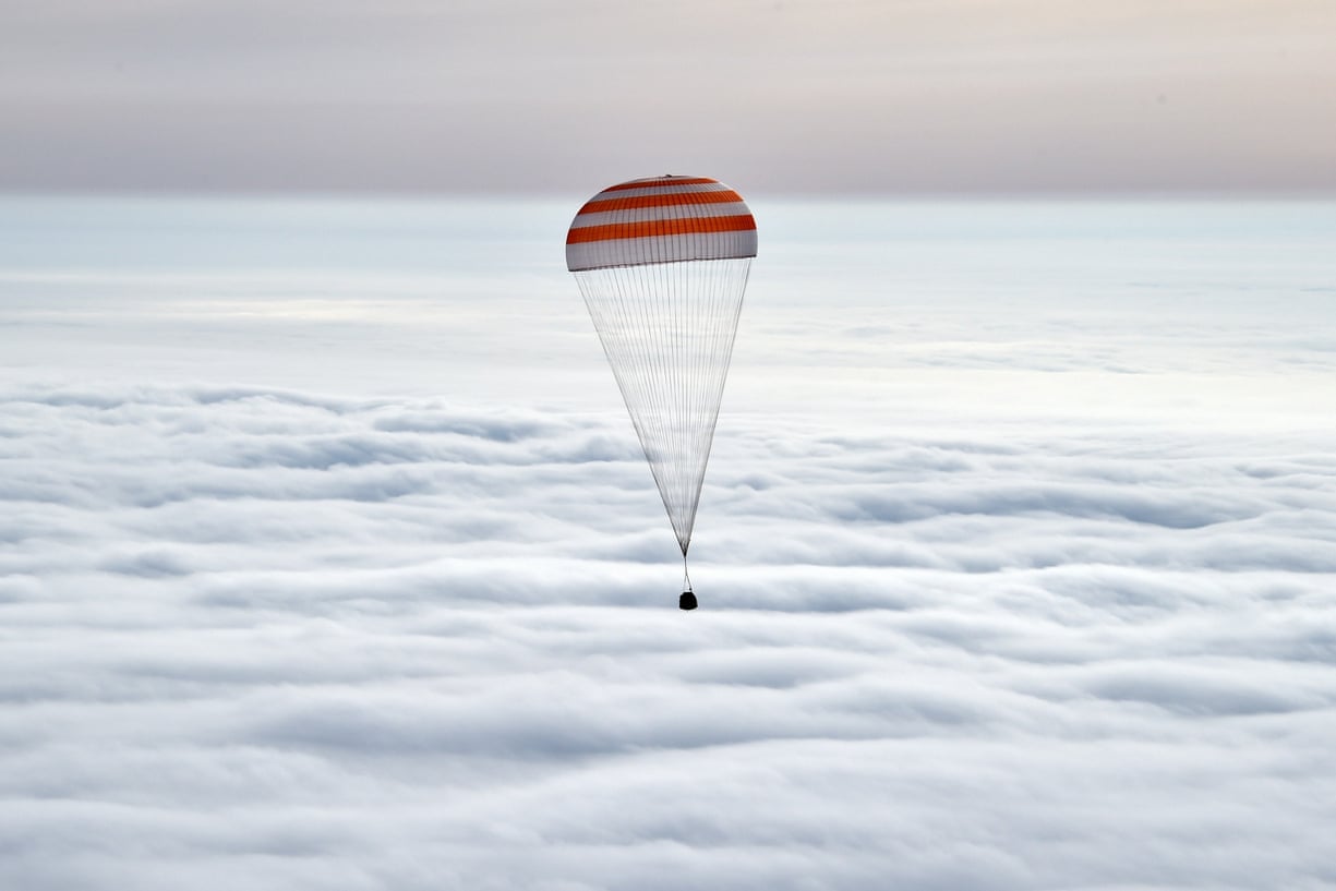 Russia’s space capsule carrying the International Space Station crew of US astronaut Scott Kelly and Russian cosmonauts Mikhail Kornienko and Sergei Volkov descends towards a remote area outside the town of Dzhezkazgan