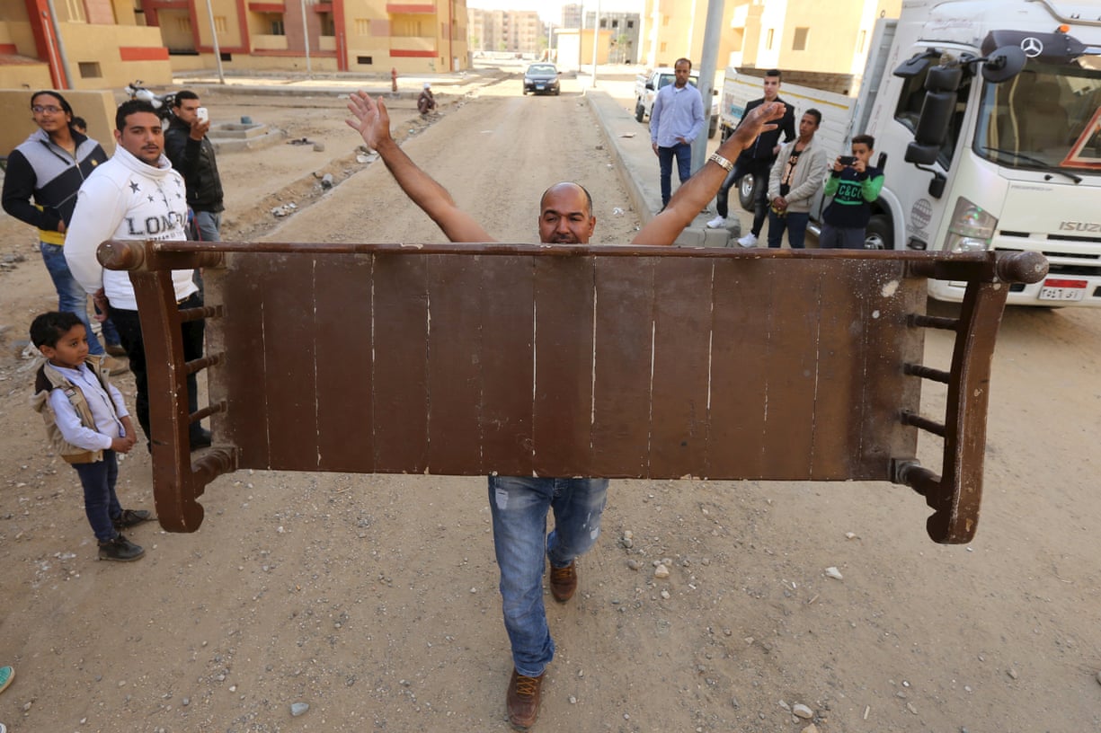 Strongman Karim Hussein, who washes in glass and eats nails, carries a wooden bench through the street with his teeth