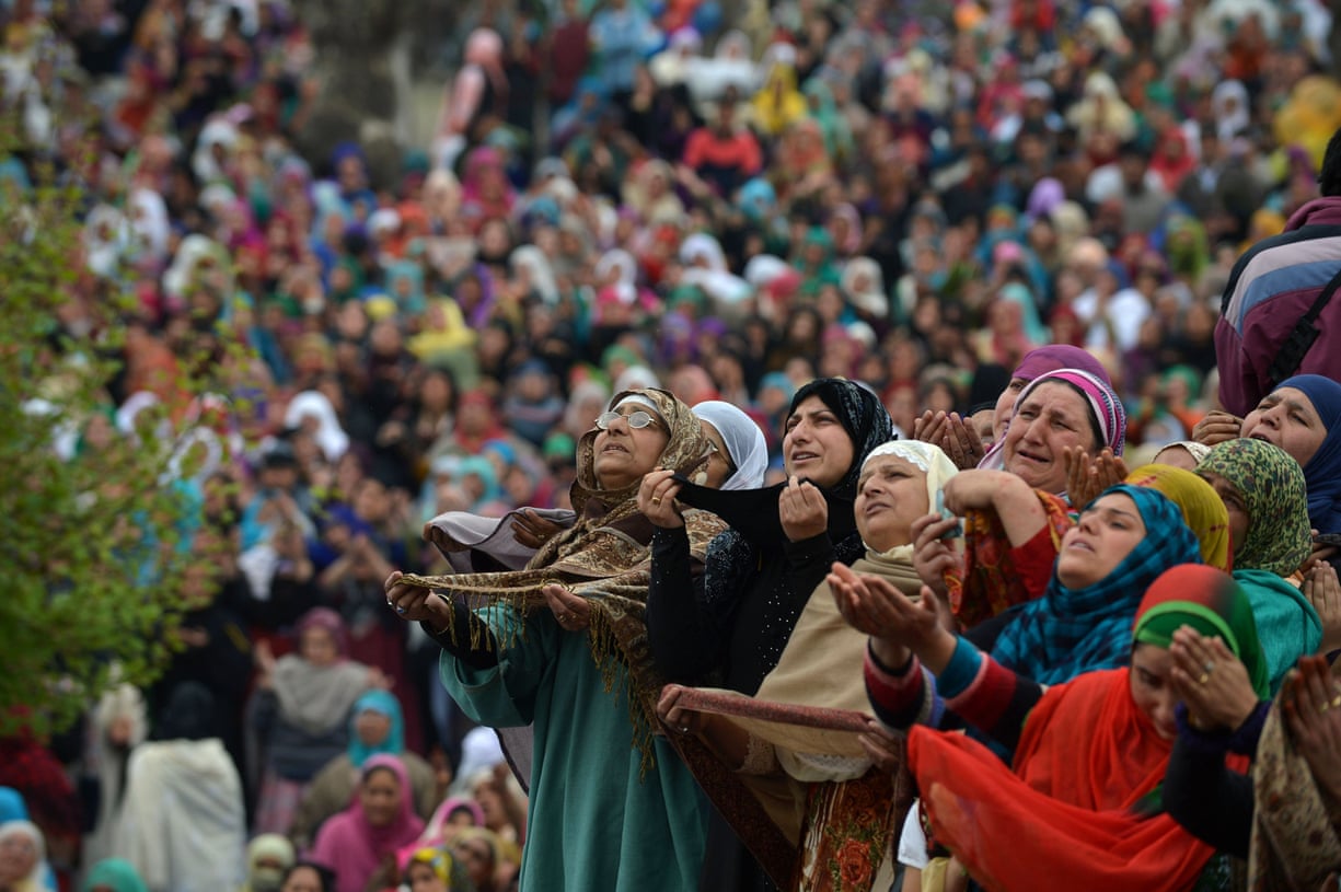 Kashmiri Muslims cry as they pray upon seeing a relic believed to be hair from the beard of Prophet Mohammed during a festival to mark the death anniversary of Abu Bakr, one of the companions of Prophet Mohammad, at the Hazratbal shrine in Srinagar, Indian-controlled Kashmir.