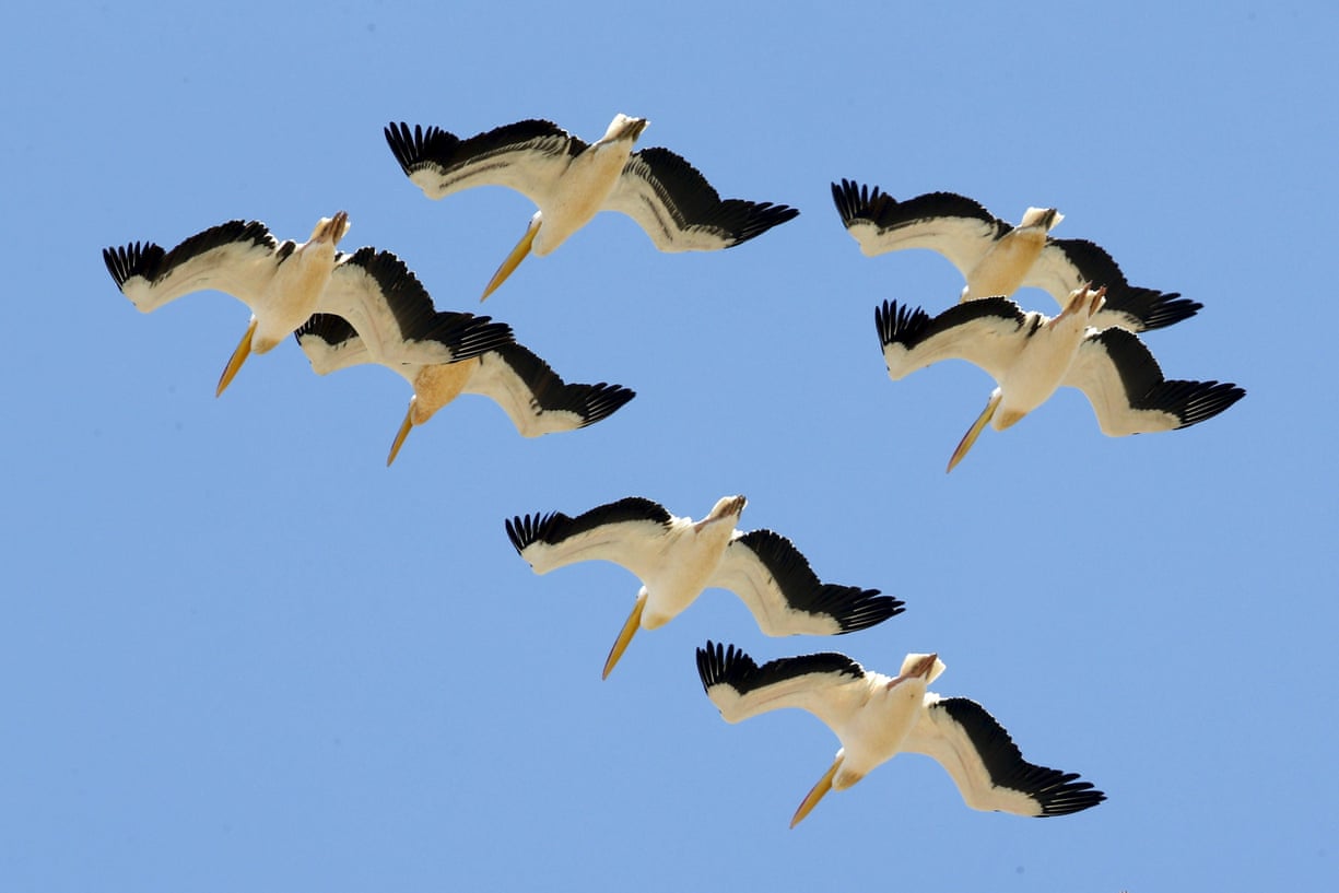 Pelicans fly above agricultural fields