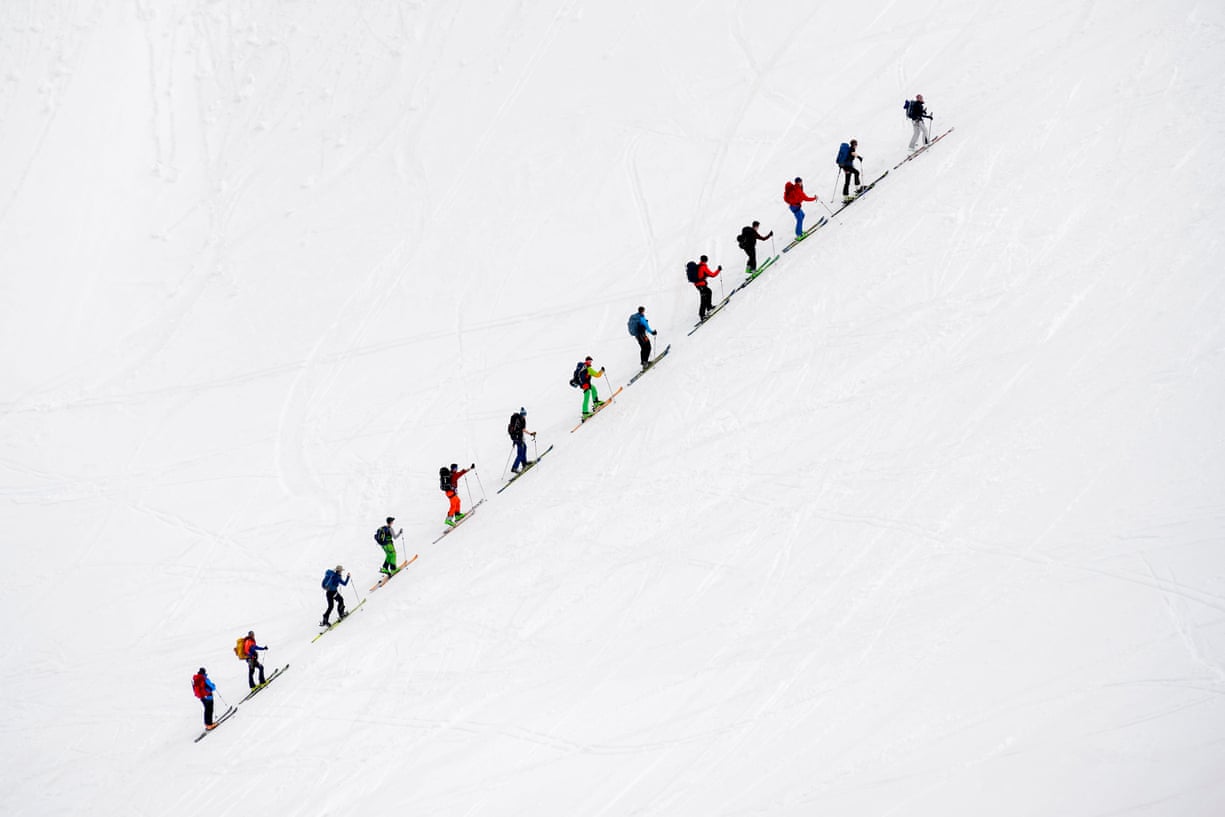 Members of a ski touring group climb to the Bec des Rosses mountain above the Swiss Alps