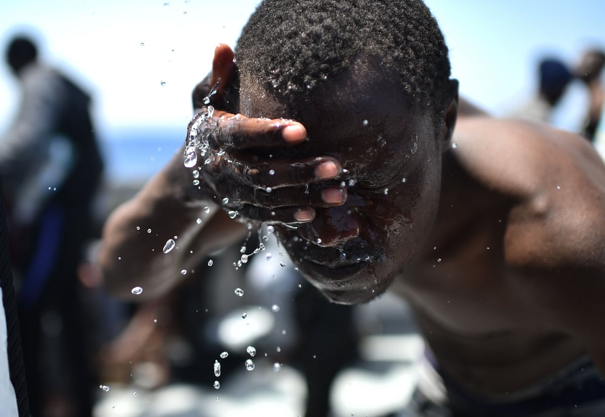 A man sprinkles water on to his face after being rescued during an operation by SOS Méditerranée and Medécins Sans Frontières