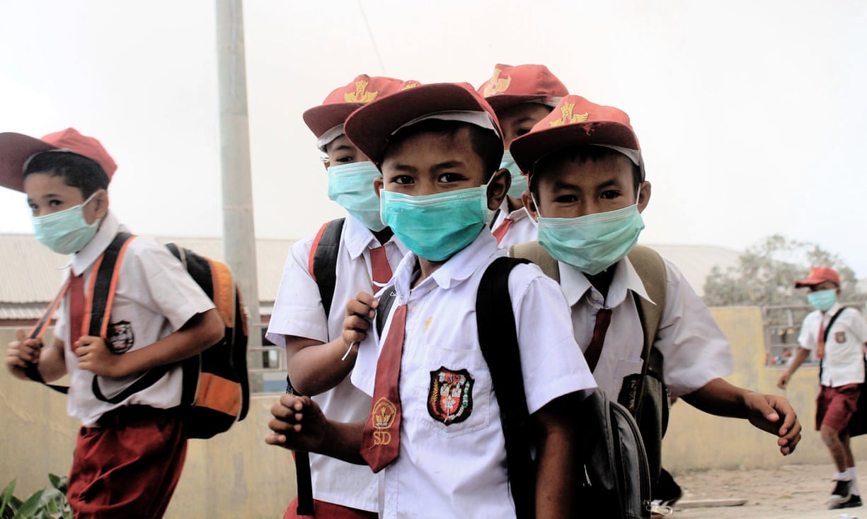 Primary school children wear masks after the eruption of Mount Sinabung