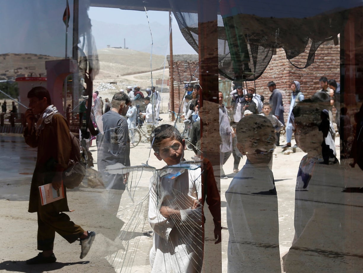 Afghan boys look a damaged window of a shop after a suicide attack