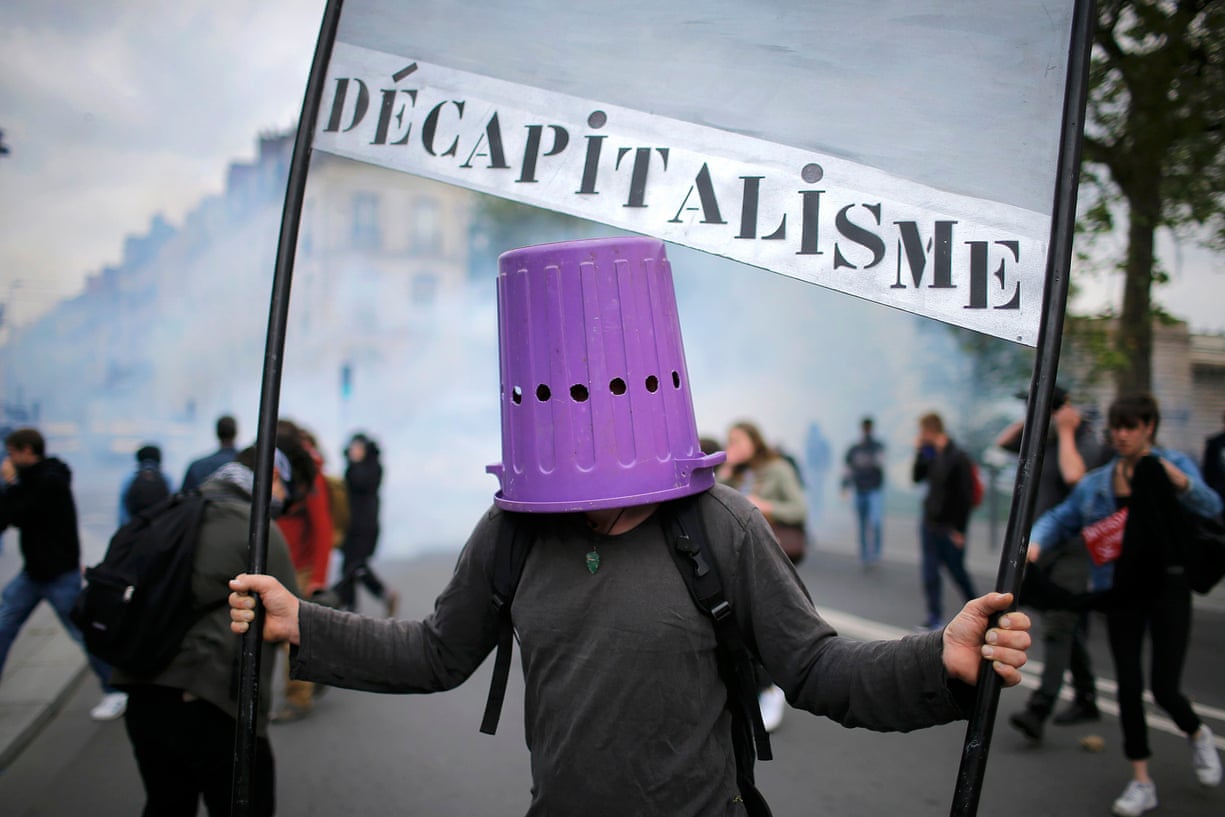 A protester wears a bin during a demonstration against changes to French labour laws