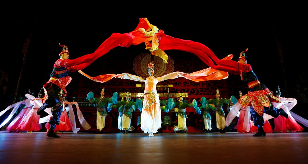 Members of the Imperial Bells of China dance troupe perform during their tour of the country