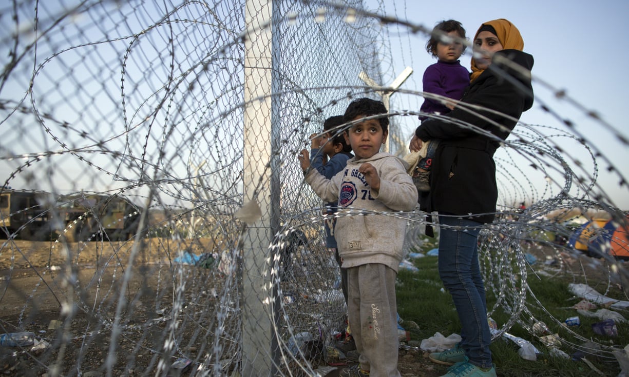 Refugees gather at the barbed wire fence fence at the Greek-Macedonia border in March 2016. ‘We condemn the Israelis for their separation barrier and Donald Trump for his ludicrous Mexican fence. But are we really so different?’ Photograph: Dan Kitwood/Getty