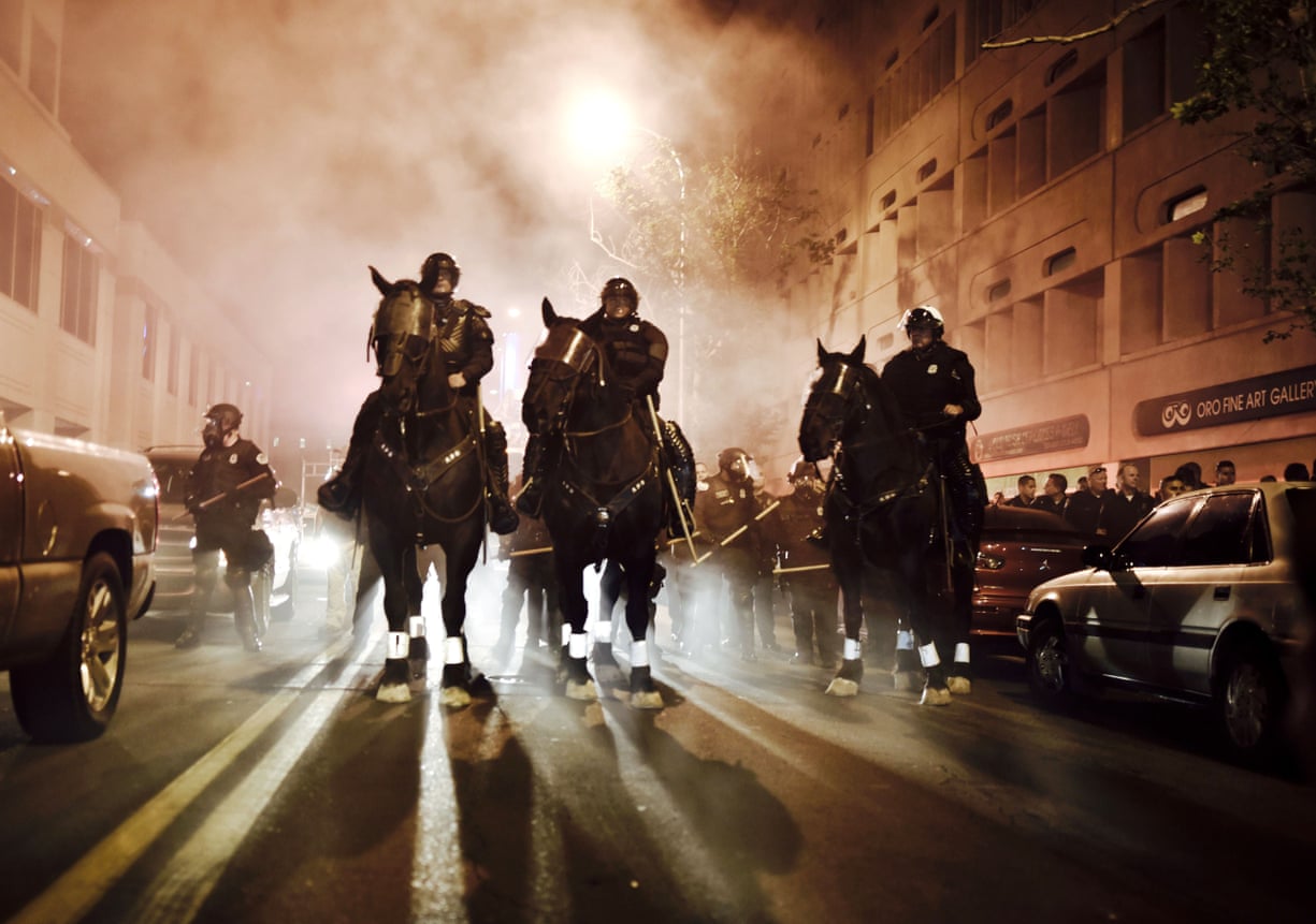 Mounted police on 3rd Street as protesters remained outside the Convention Centre after Donald Trump’s rally
