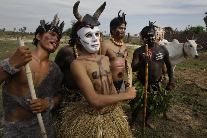Young people take part in a ceremony to exorcise evil spirits and pray for rain in the rice-planting season