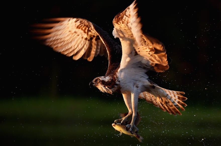 An Osprey catches two Rainbow Trout at Rothiemurchus on June 6, 2016 in Kincraig, Scotland. Ospreys migrate each spring from Africa and nest in tall pine trees around the Aviemore area, the raptor was hunted to the point of extinction in the Victorian era, their migratory habits eventually brought them back to Scotland with the first successful breeding pair being recorded in 1954. (Photo by Jeff J. Mitchell/Getty Images)