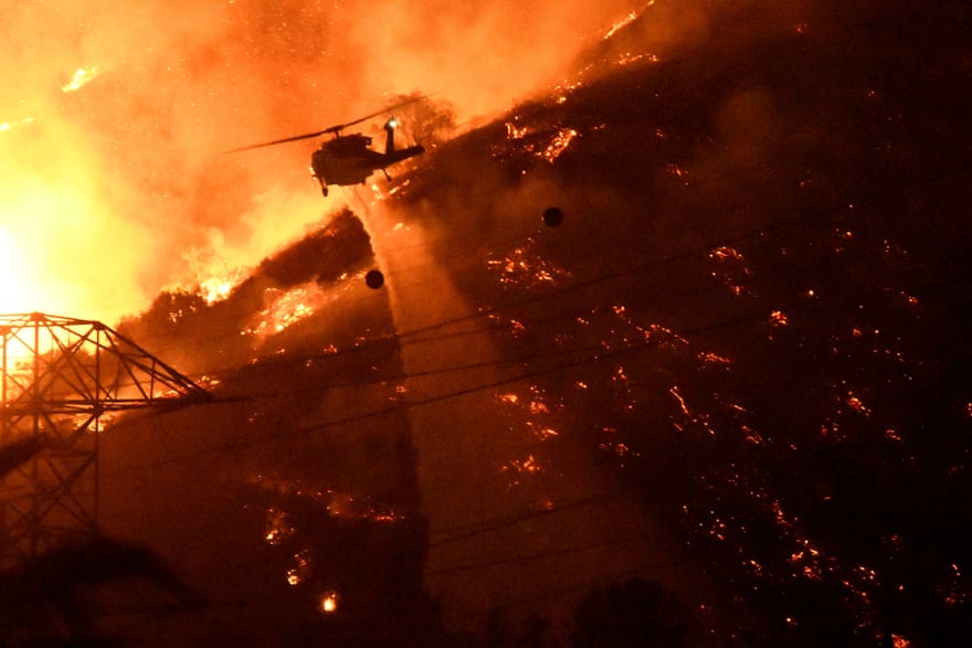 A Los Angeles county fire helicopter drops water while battling a blaze dubbed the “fish fire”