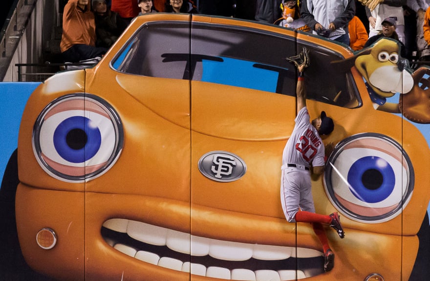 Boston Red Sox left fielder Chris Young jumps for the ball